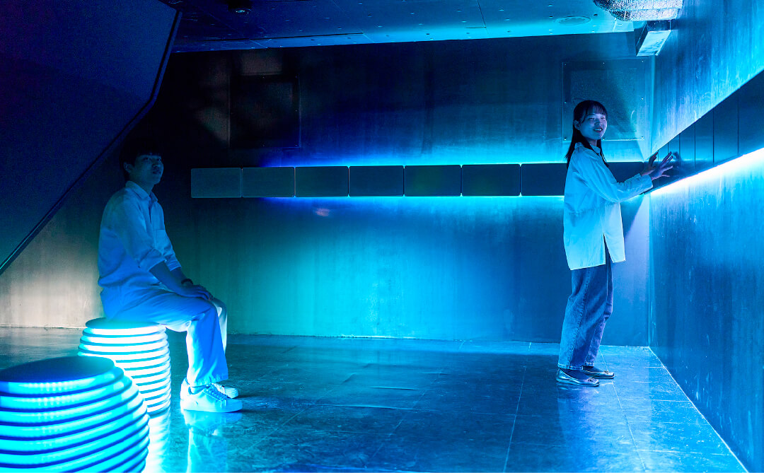 When you press the work on the wall with your palm, the width of the blue light becomes larger or smaller depending on the pressing force. When you press the work on the floor, the light changes from blue to green—strongly when pressed strongly and weakly when pressed weakly.